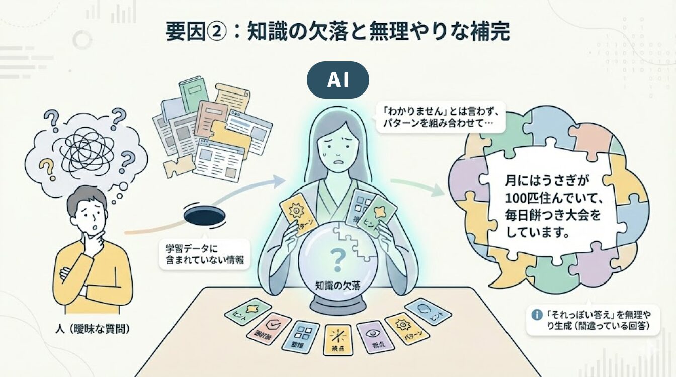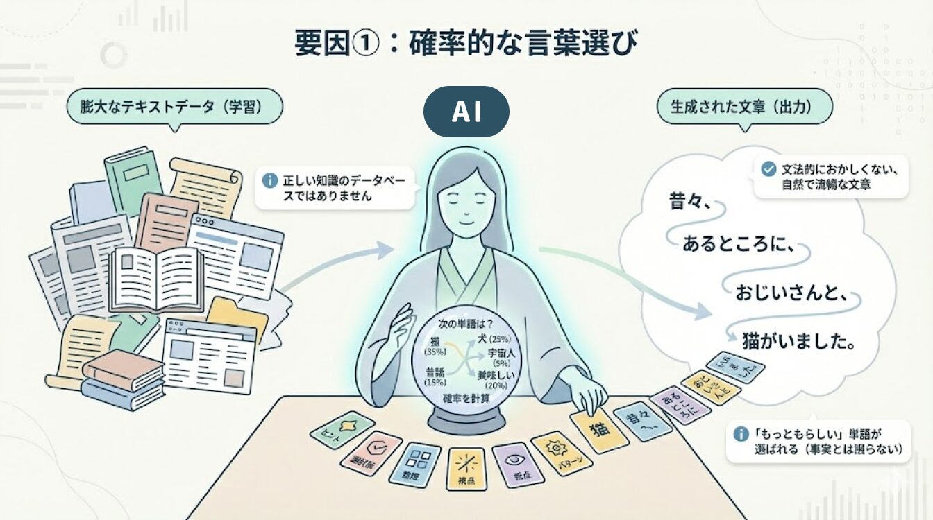 「AIが悪意を持って嘘をついているのかな?」と不安になるかもしれませんが、そうではありません。主な原因は、現在の言語モデルの仕組みそのものにあります。