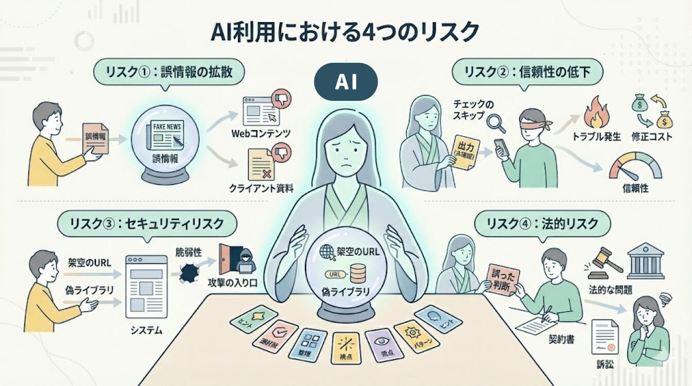 AIの出力を過信し、裏付けを取らずに使うことで、トラブルや修正コストが発生することも。